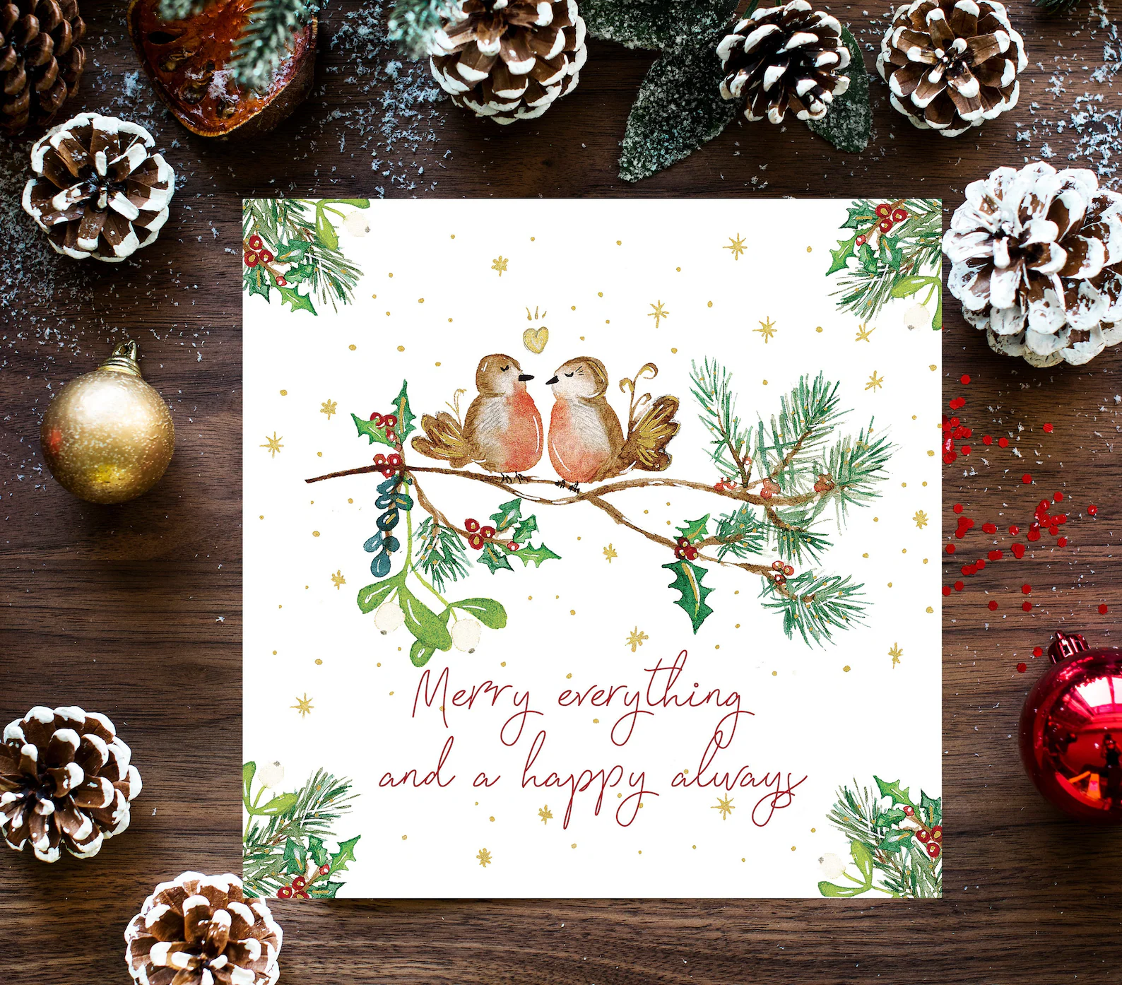🎄 Reproduction de mon illustration originale intitulée « Les rouges-gorges de Noël » réalisée à l’aquarelle.
